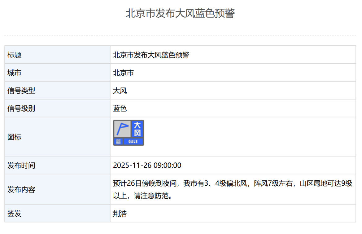 北京市发布大风蓝色预警:预计26日傍晚到夜间,我市有3、4级偏北风,阵风7级左右,山区局地可达9级以上,请注意防范。