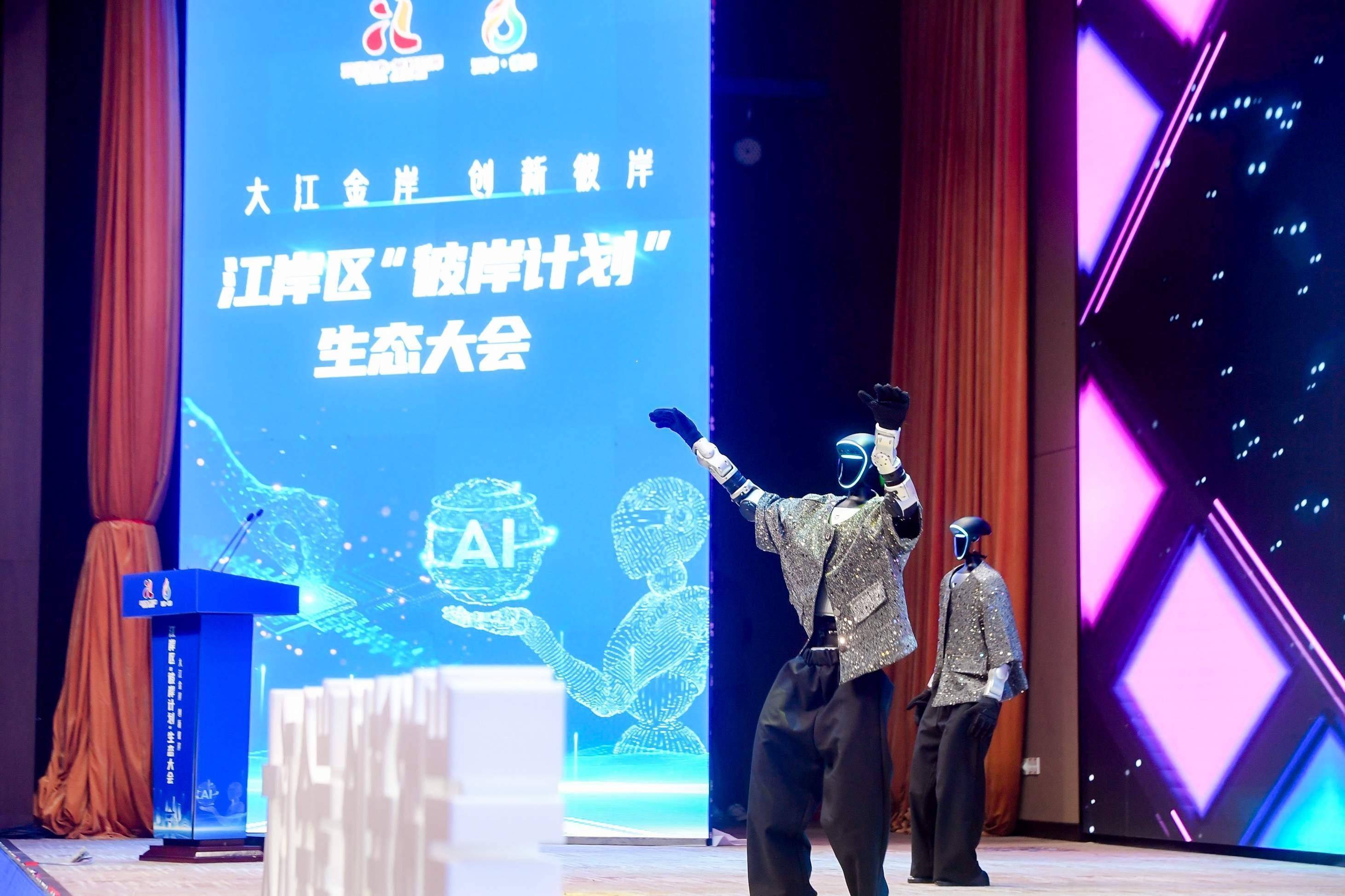 江岸区“彼岸计划”生态大会现场,“地标马克”机器人跳舞。