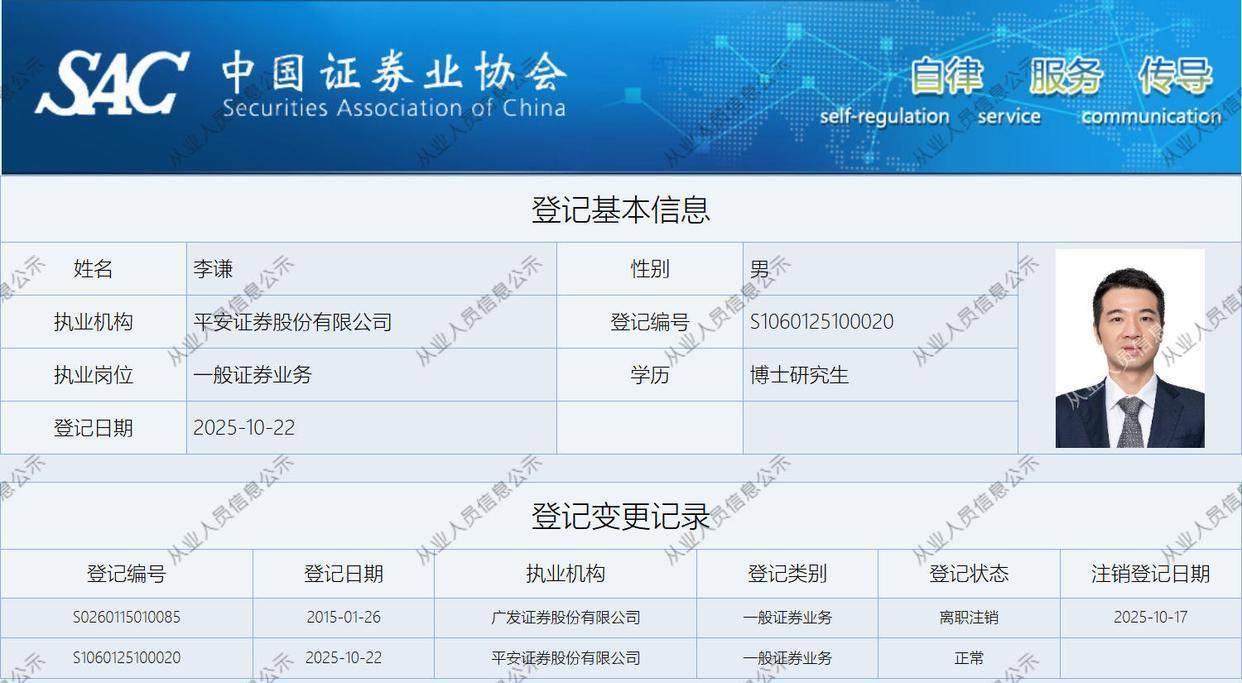 目前中国证券业协会官网已更新李谦执业信息,其于10月22日完成登记备案。据悉,李谦已于本周到岗平安证券。截至发稿,平安证券董监高团队信息尚未更新。