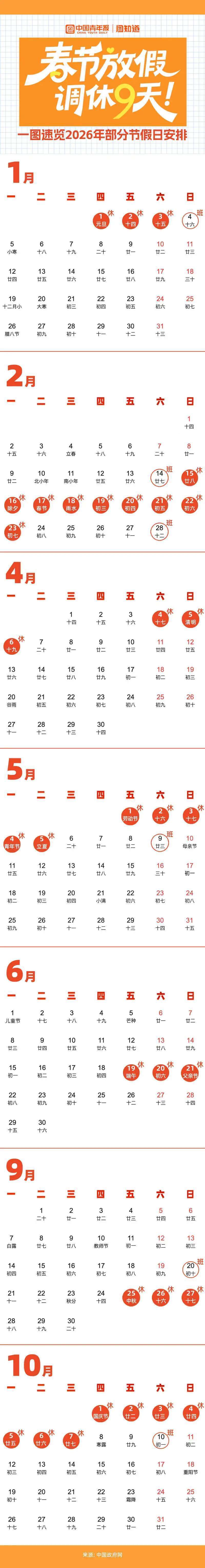 图知道|春节放假调休9天!一图速览2026年部分节假日安排