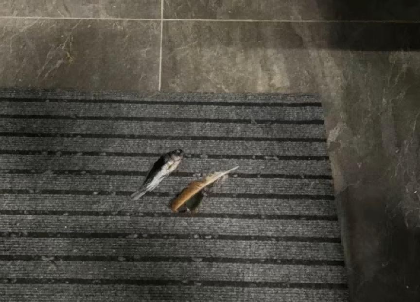 晚上打开门,看见我家猫给我送了一根羽毛和一条小鱼,摆得整整齐齐。
