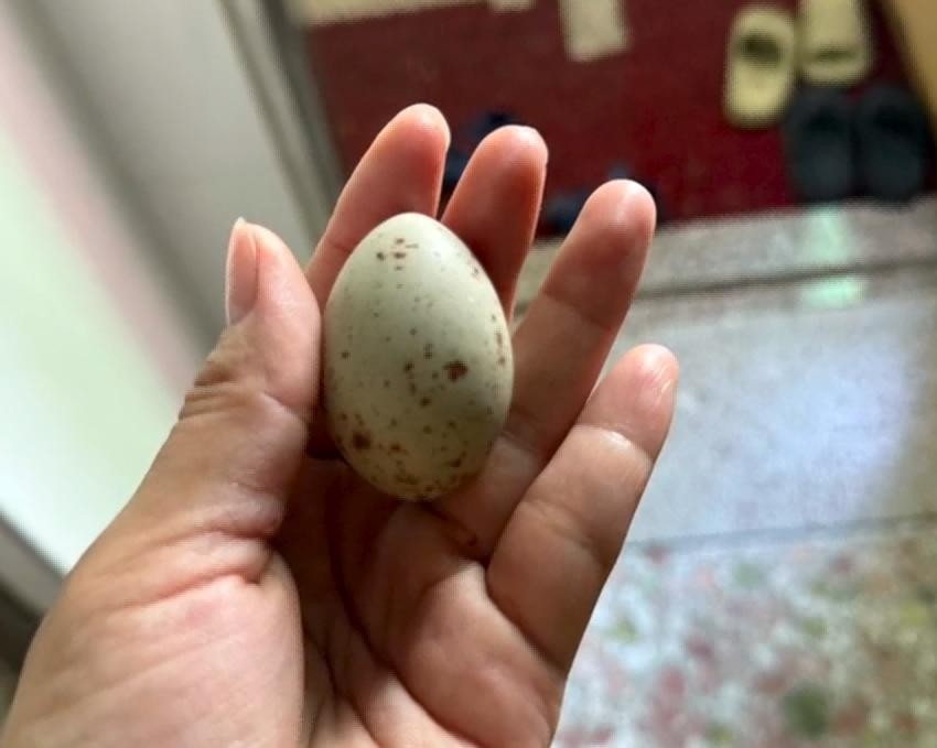 几天前,她回家的路上一直没看见大橘,但到家门口时,却看见门口的垫子上有一颗完完整整的蛋。
