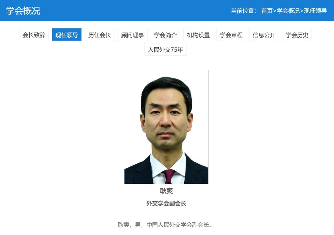 据中国人民外交学会官网显示:耿爽已任中国人民外交学会副会长。