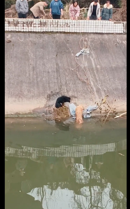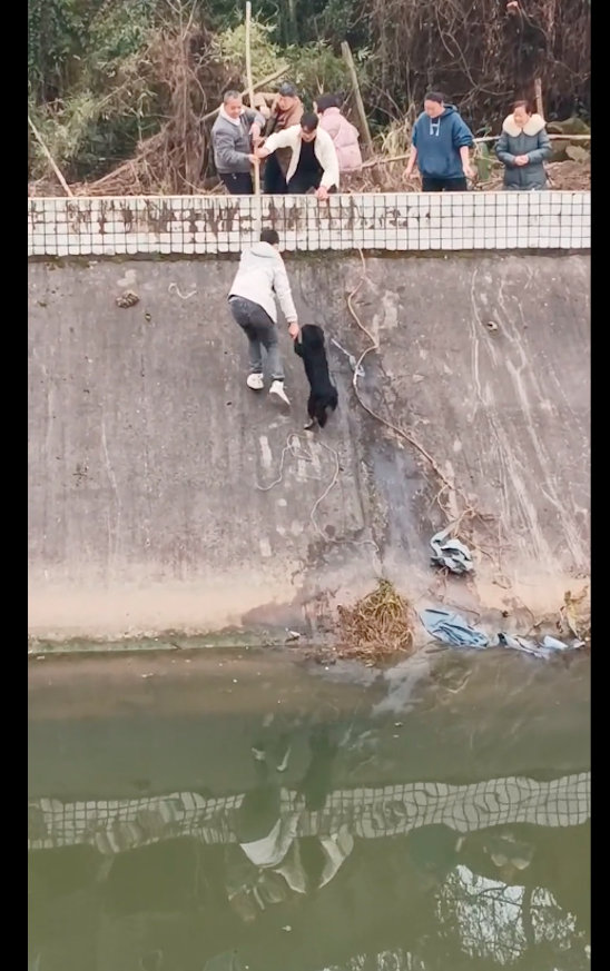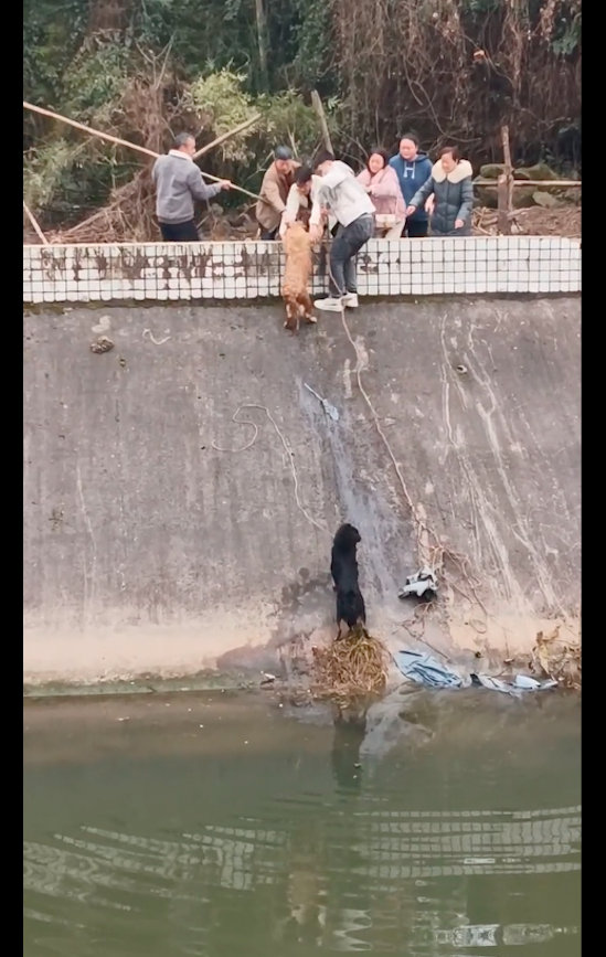 最终是有一位年轻的小伙,上面的人拉着竹竿,而他就顺着竹竿下去拉狗狗,就这样接连将两只狗狗都拉回到了岸上!为救狗狗的人们都点个赞,当然也为这只小黑狗点个赞,为救同伴自己差点都陷入两难的境地!如果我们遇到这样的事情,一定要首先保证自己的安全,再想办法去救别人哦!