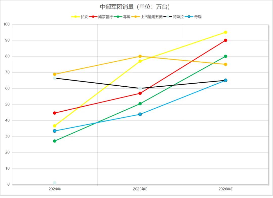 这一部分的汽车厂商最多,包括长安、鸿蒙智行、零跑、上汽通用五菱、特斯拉、奇瑞6家。2026年,他们的新能源汽车销量预计在60-100万辆之间。