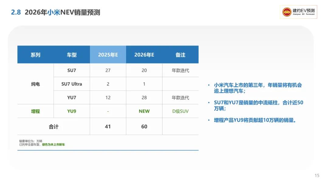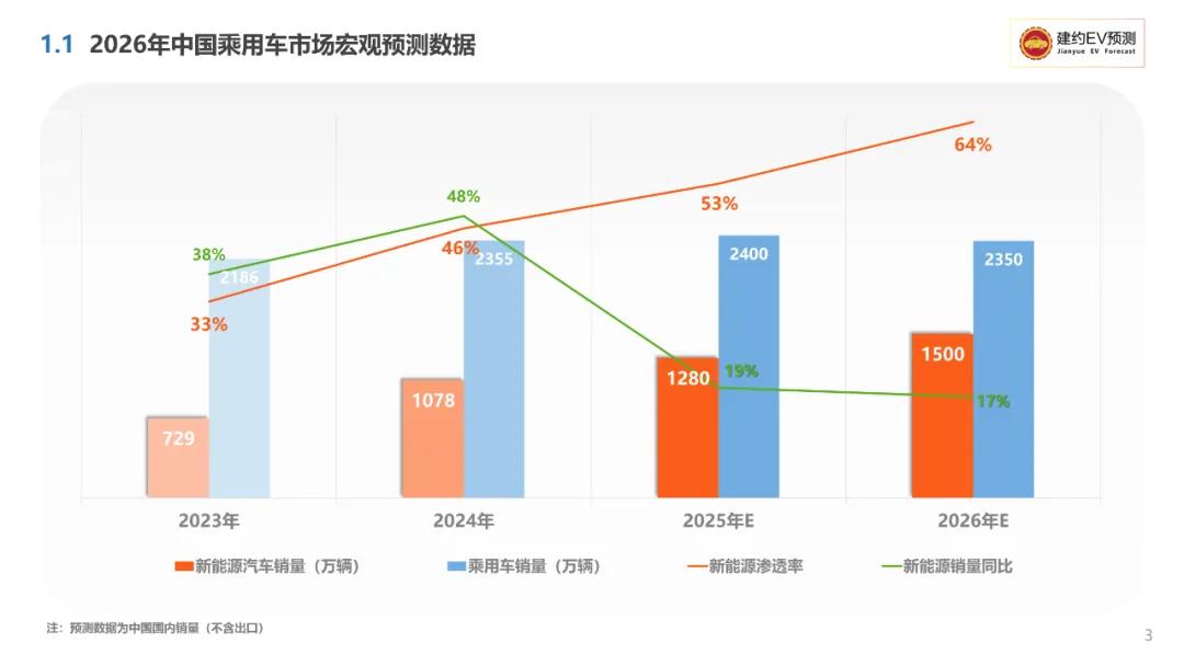 对于明年的市场前景,建约EV预测也给出了偏保守的数据:预计2026年,中国国内市场新能源汽车的销量将达到1500万辆,增长率进一步下跌到17%。
