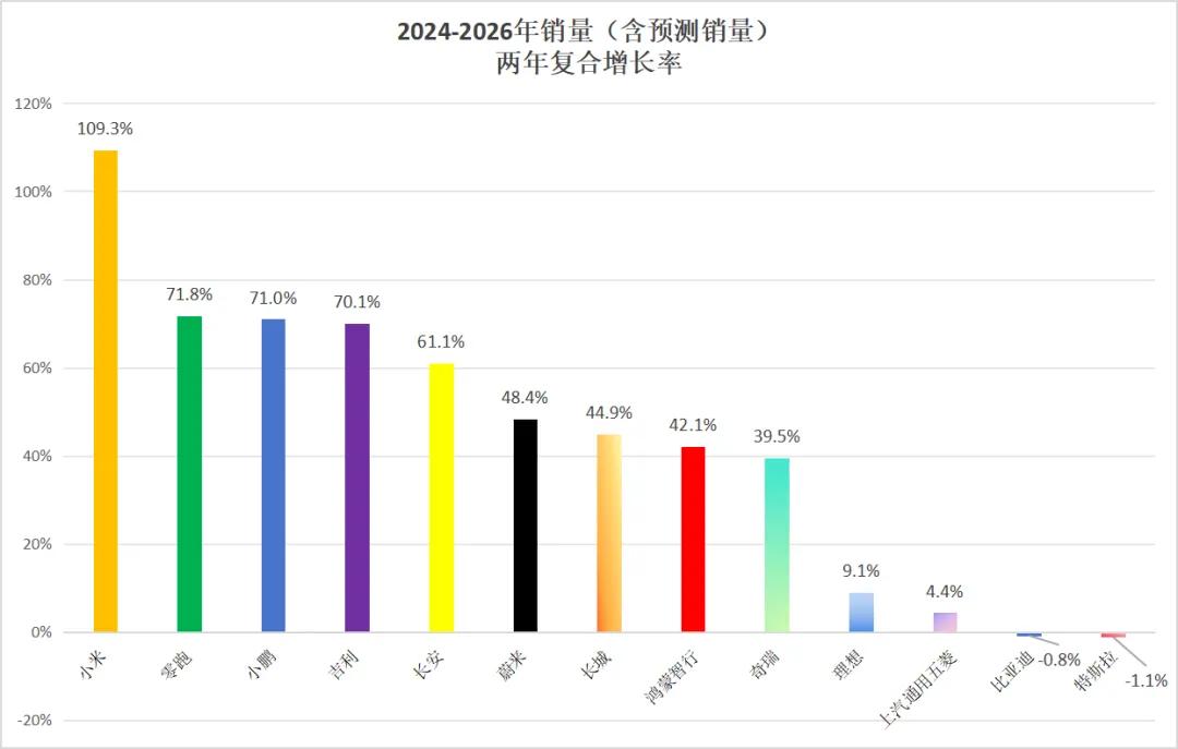 “十三太保”当中,到底谁跑得更快呢?老冀根据建约EV预测的预测做了个简单的计算:2024-2026年三年,以年销量(或者是预计年销量)的复合增长率计算,小米以109.3%的惊人速度拔得头筹,“黑马”零跑则以71.8%的增长率夺得亚军,增速为71%的小鹏以微弱的差距挤进三强。